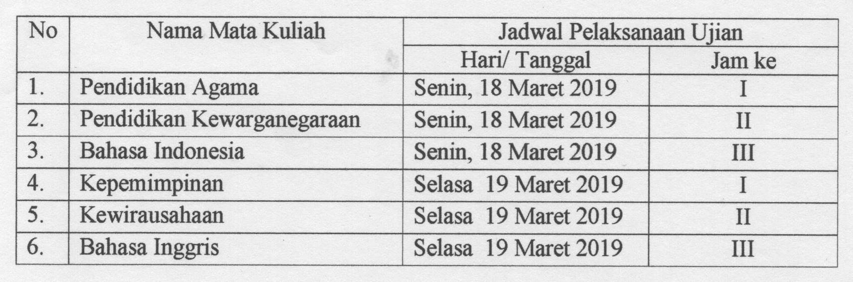 Jadwal UTS Semester Genap TA.18/19 MKWU