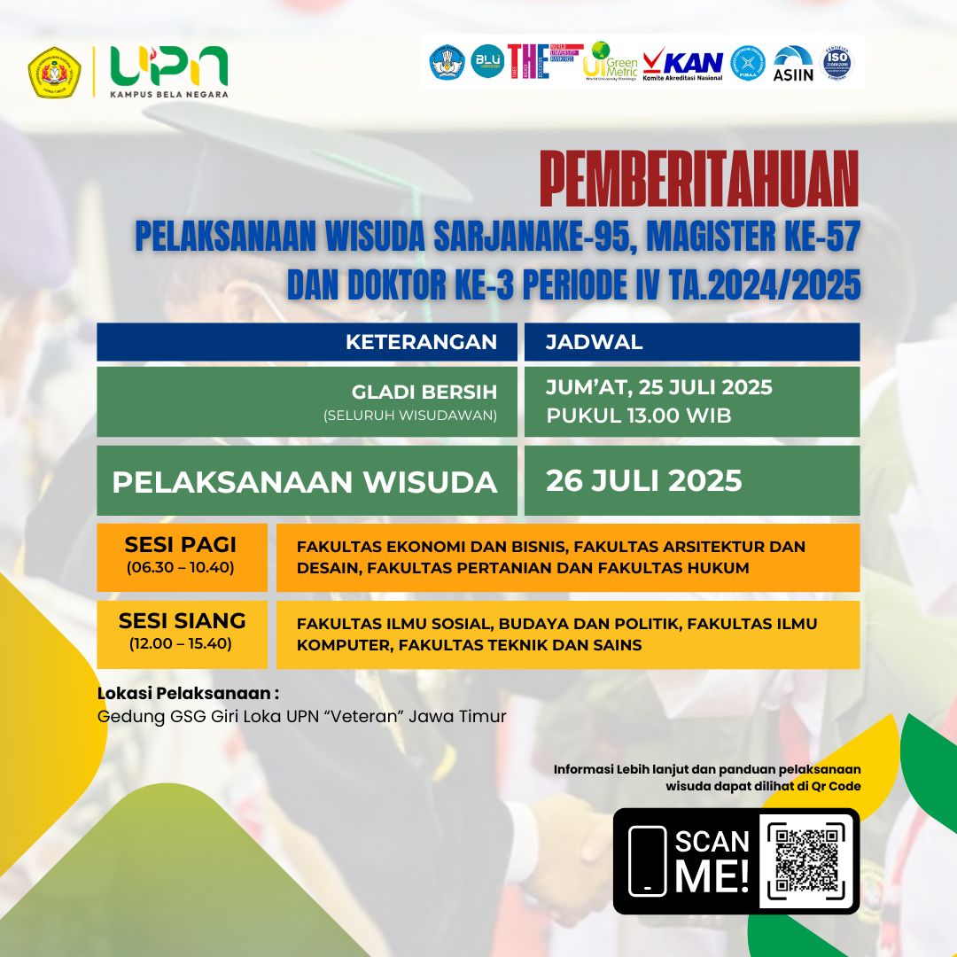 Tempat : Untuk Toga di GSG Giri Loka UPN Veteran Jawa Timur, untuk Undangan di Biro BAKPK Gedung Rektorat UPN Veteran Jawa Timur